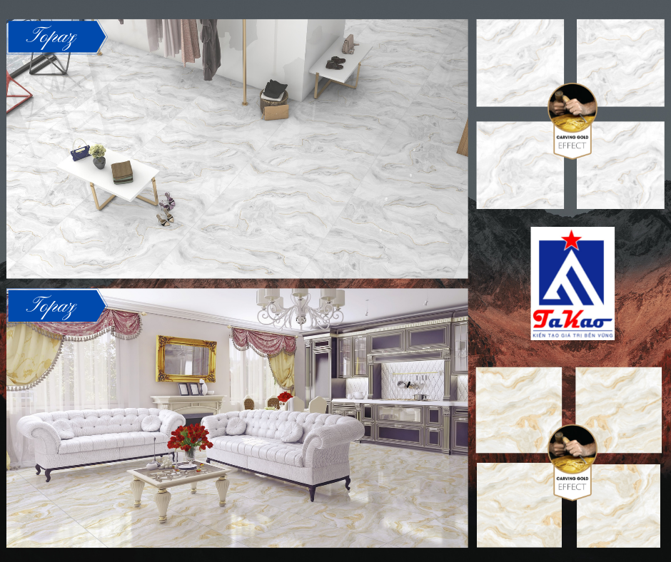 Sản phẩm gạch ốp lát của Takao được nhiều khách hàng tin tưởng, đánh giá cao cả về chất lượng và tính thẩm mỹ. Ứng dụng công nghệ hiện đại, kết hợp cùng quy trình sản xuất nghiêm ngặt, khép kín và đạt chuẩn, vì thế mỗi một sản phẩm đưa ra thị trường luôn được đảm bảo chất lượng về độ bền, độ cứng, khả năng chống mài mòn, độ chuẩn của màu sắc,…. Bên cạnh đó, thiết kế sang trọng, hiện đại, họa tiết chân thực, sống động, phù hợp với xu hướng, thích hợp với nhiều phong cách thiết kế công trình từ nhà dân sinh tới biệt thự trung tâm thương mại,…