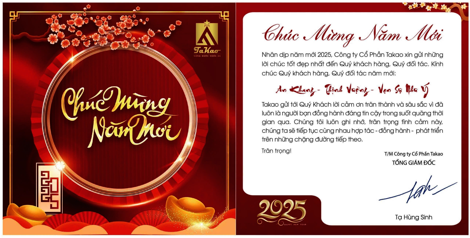 Một năm mới 2025 đã đến, thay mặt cho toàn thể cán bộ công nhân viên thuộc hệ thống công ty cổ phần Takao, ông Tạ Hùng Sinh - Phó chủ tịch hội đồng quản trị, kiêm Tổng giám đốc gửi đến Quý khách hàng, Quý nhà phân phối lời chúc mừng xuân mới!