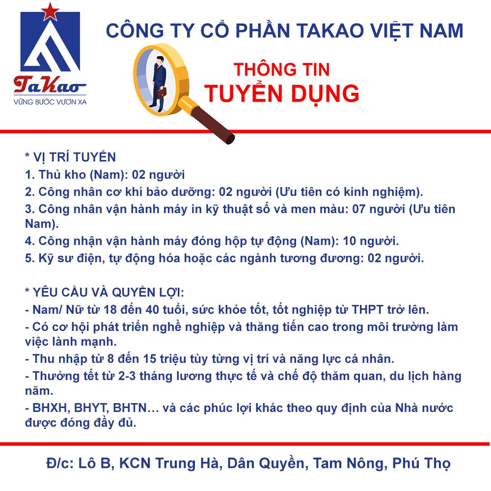 TAKAO VIỆT NAM TUYỂN NHÂN SỰTác giảBradChu14:41 - 19/03/2024Takao Việt Nam là nhà máy đầu tiên trong hệ thống của Công ty cổ phần Takao, tại Lô B, KCN Trung Hà, Dân Quyền, Tam Nông, Phú Thọ Chia sẻ: